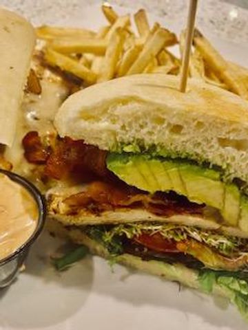 Grilled fresh marinated chicken breast, with baby greens, tomatoes, alfalfa sprouts and avocado topped with slice of Swiss cheese and bacon served on ciabatta bread ~ 16.95