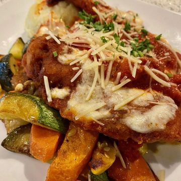 Lightly breaded chicken breast topped with a marinara sauce and aged parmesan cheese.