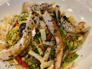 Napa cabbage mixed with carrots, snow peas, cilantro, green onions, and roasted peanuts tossed with house made red peanut oil chili vinaigrette, served with fresh grilled chicken breast ~ 17.95