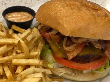 Angus beef patty with house made onion strings, bacon, lettuce,