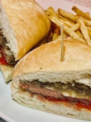 Grilled steak sandwich with roasted red bell peppers, caramelized onions, sautéed mushrooms with Swiss cheese served on ciabatta bread ~ 17.95