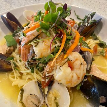Sautéed clams, mussels, prawns and fish with lemon garlic sauce tossed with linguine pasta,